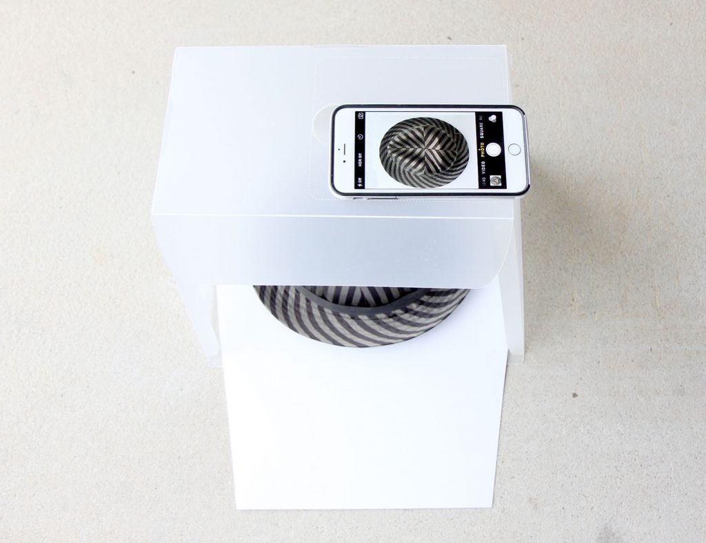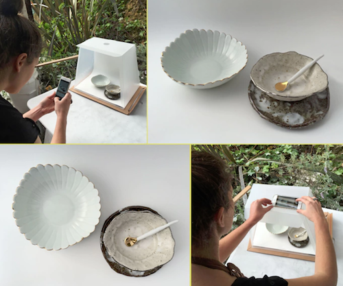 通常のフォトスタジオのように正面からの撮影はもちろんのこと、製品上部に専用のカメラホールがあり、そこから撮影すると、真上からの写真が簡単に撮影可能です。