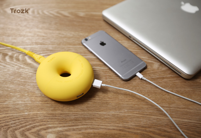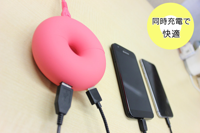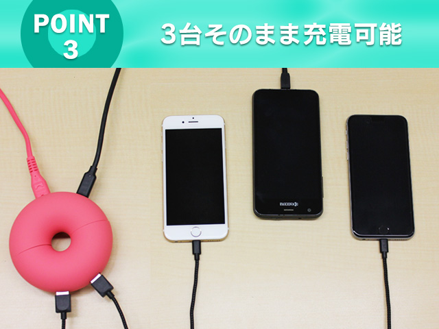 ▼ドーナツ型の丸い状態でスマホが最大3台充電可能。