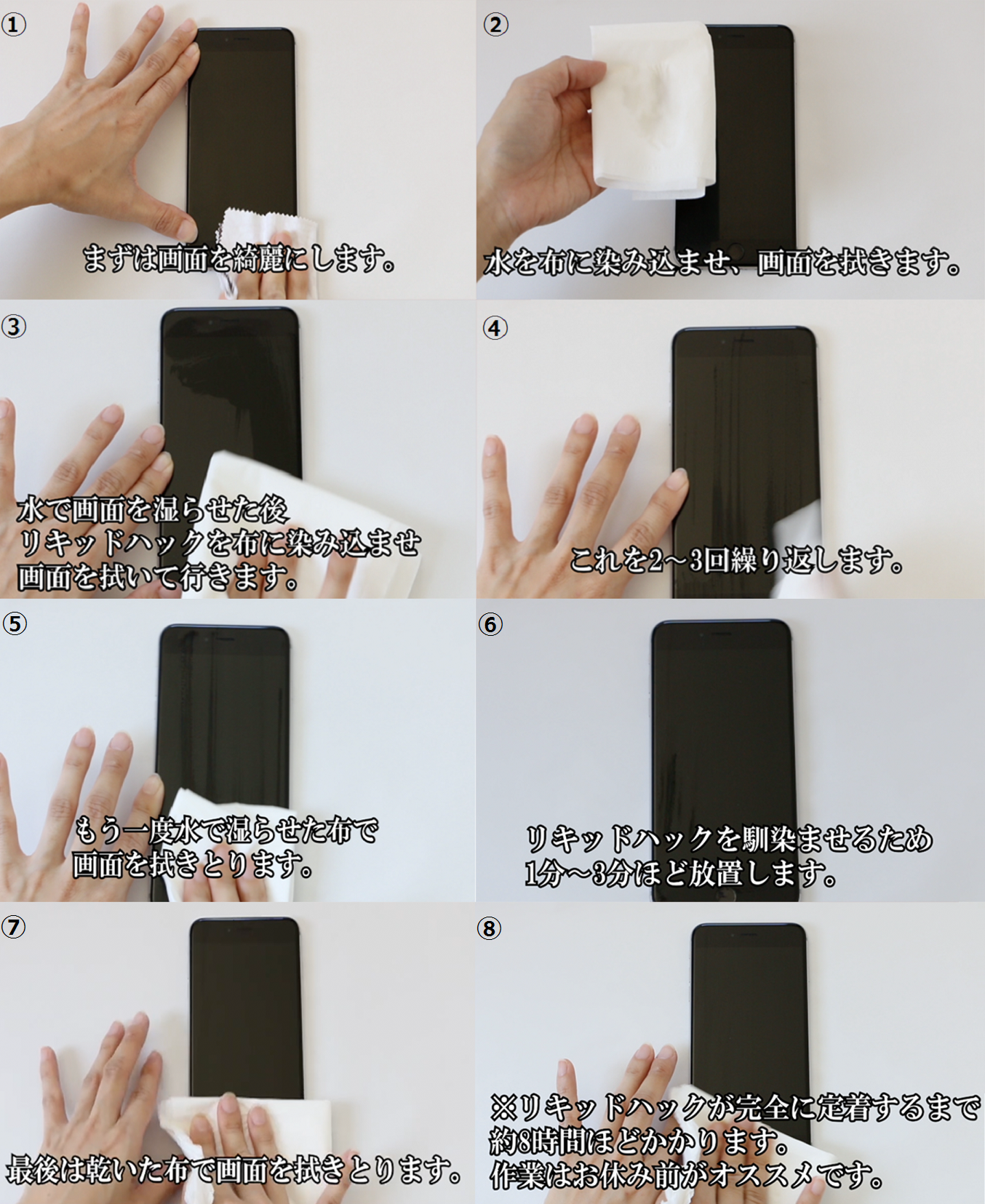 また、⑥の工程の後、すぐにご使用いただいても問題ありませんが、LIQUID_hackが完全に定着するには約8時間かかりますので、ご就寝前に作業するなどして、8時間放置しておいた方がより効果的です。