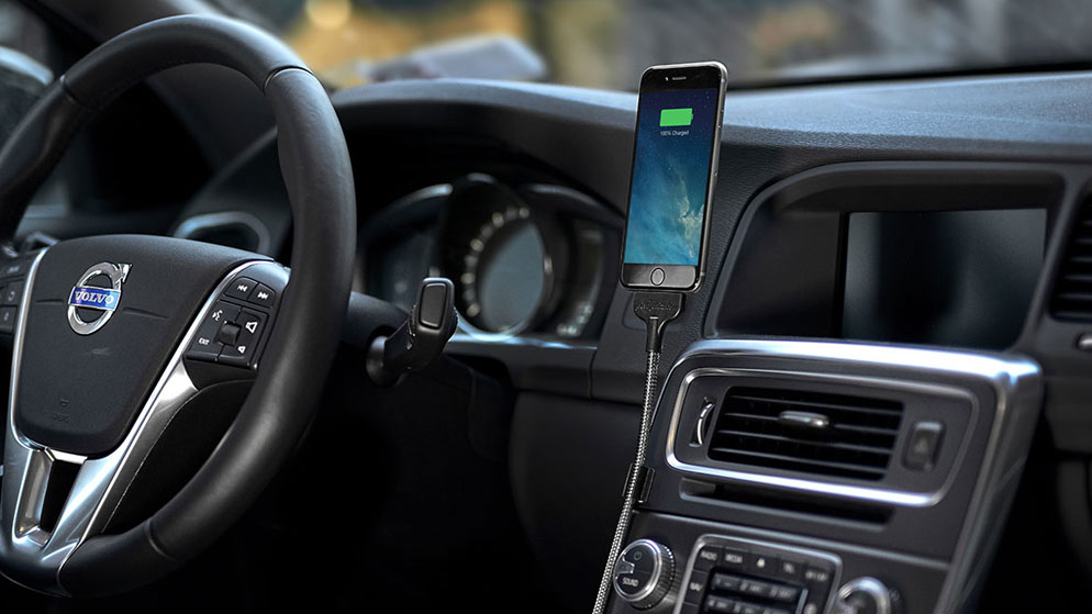▼車内でiPhoneを充電しながら自立するライトニングケーブル「BOBINE AUTO(ボビンオート)」